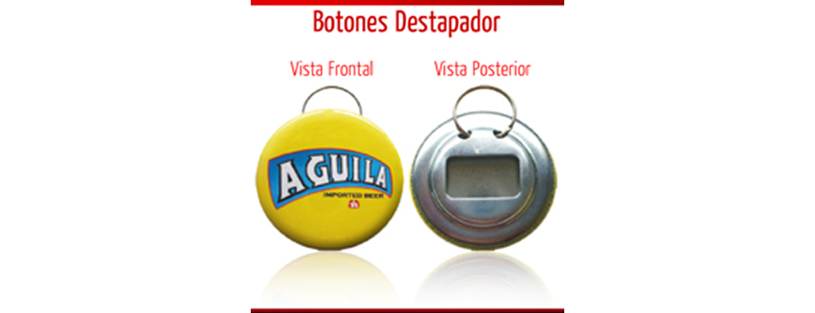 Elaboramos botones publicitarios redondos y de varios usos como destapador , llavero etc , con medidas de 10 mm, 8.5 mm,7.5 mm,6.5 mm y 5.5 mm ,además también tenemos botones rectagulares de 6.4 mm, etc.